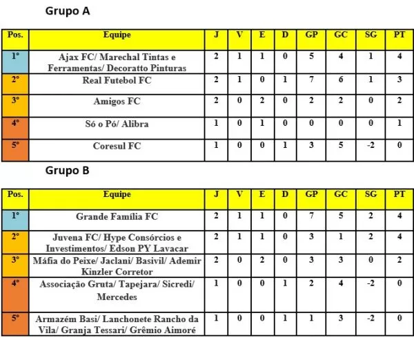 Pelo Grupo A, a rodada começou com empate por 0 a 0 entre Só o Pó/ Alibra e Amigos FC. Em seguida, Ajax FC/ Marechal Tintas e Ferramentas/ Decoratto Pinturas (foto), com gols de Tio Zé, Pedrinho e Richard, venceu o Real Futebol FC, que descontou com Wellinton Belo, duas vezes, por 3 a 2, e assumiu a liderança isolada da chave com quatro pontos. A Coresul FC folgou na rodada.