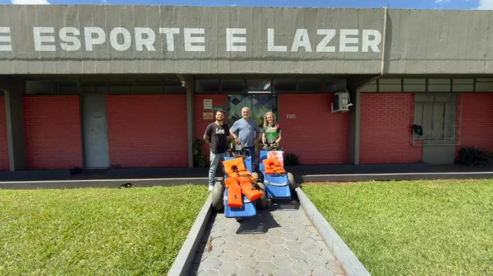 Hoje (18), a Secretaria de Esporte e Lazer, por meio da supervisão do Diretor de Esportes, Guilherme Prates Roma e da professora, Lara Beatriz Bruch, teve a satisfação de receber da Secretaria da Família e do Deficiente do Estado do Paraná duas cadeiras anfíbias: cadeiras de rodas adaptadas para o uso também na água.
